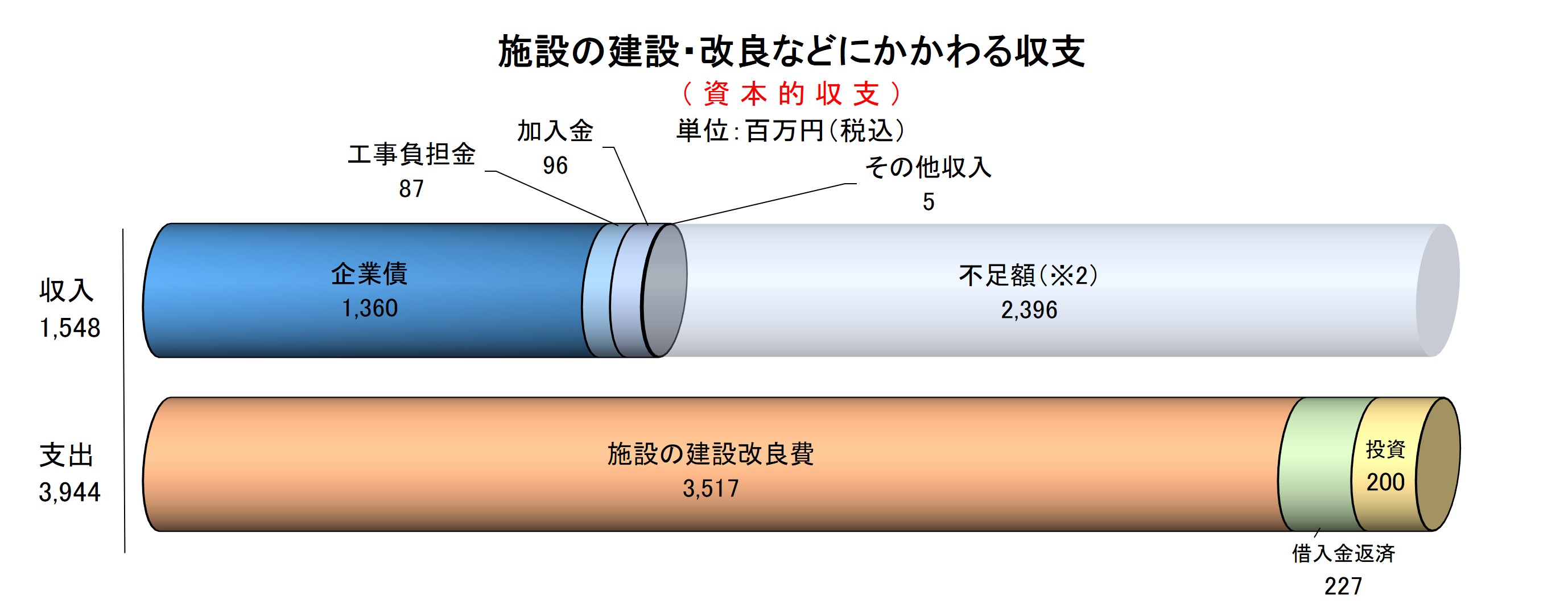 資本的収支は、収入1,548,109,322円、支出3,943,737,632円となり、2,395,628,310円の資金不足となりましたが、損益勘定留保資金(減価償却費などの現金の支出を伴わずに企業内部に留保されている資金)などで補塡しました。