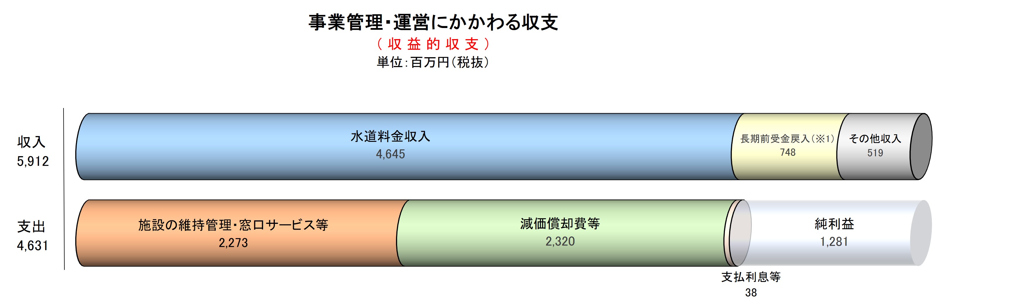 収益的収支は、収入5,912,309,447円、支出4,630,864,980円となり、1,281,444,467円の純利益となりました。