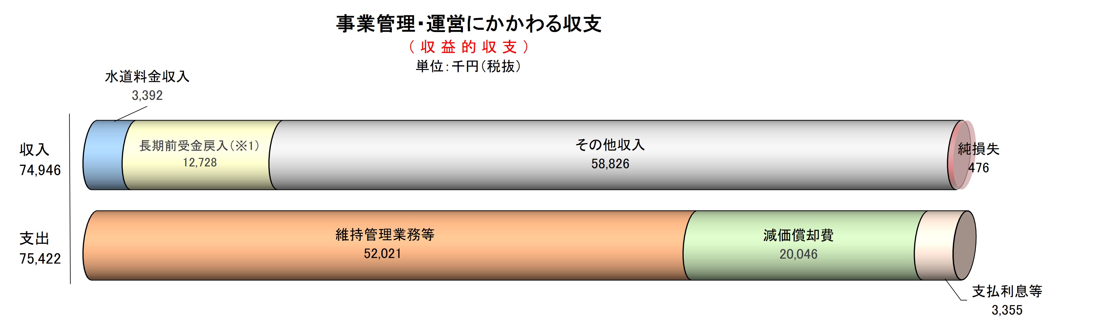 収益的収支は、収入74,946,237円、支出75,421,936円となり、475,699円の純損失となりました。