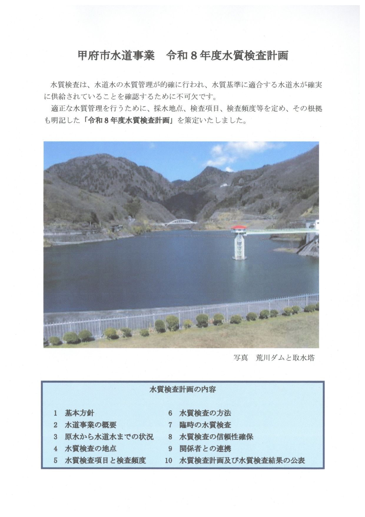 水質検査計画は、原水から水道水の水質検査により、水質基準に適合する水道水として確実に供給するため、毎年策定し、調査結果の公表を行っています。