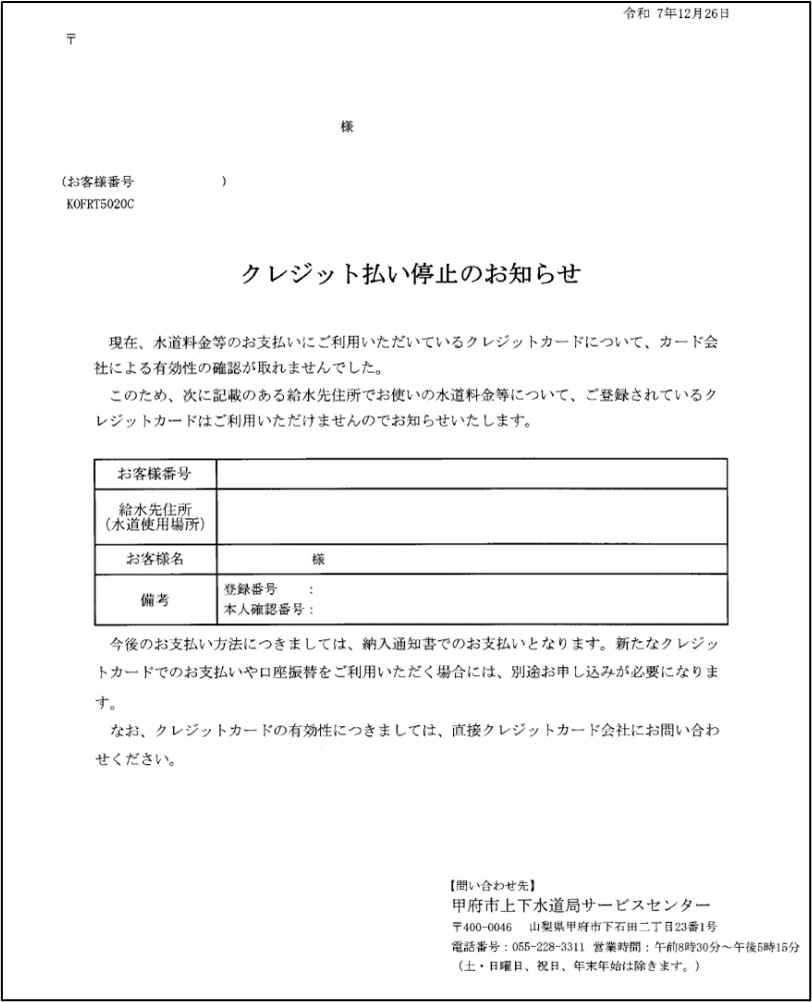 ※1 「クレジット払い停止のお知らせ」見本