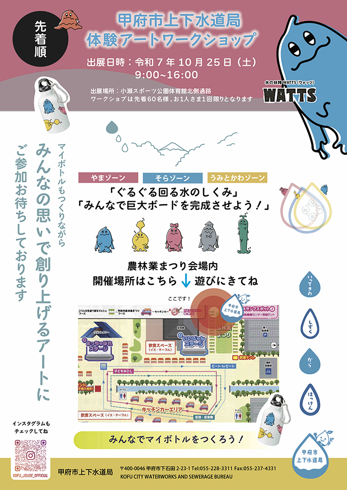 甲府市上下水道局のイメージキャラクターウォッツが紹介する水の循環を表現した巨大ボードに、しずくやメッセージを書いた透明なフィルムを重ねて、アートを完成させましょう!また、ウォッツたちのシールを貼って、オリジナルマイボトルも作れます。